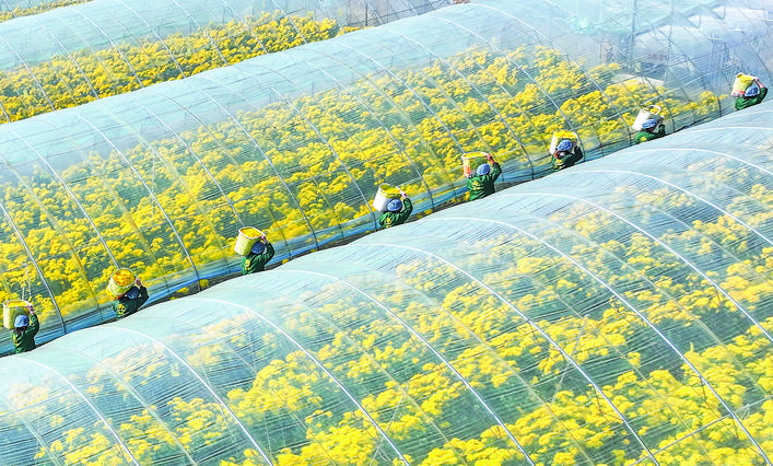 该公司种植的金丝皇菊在拱棚中生长,菊花与外界隔离,不受粉尘、虫害影响。员工采摘时统一采取防护措施,确保采摘的菊花不受污染。