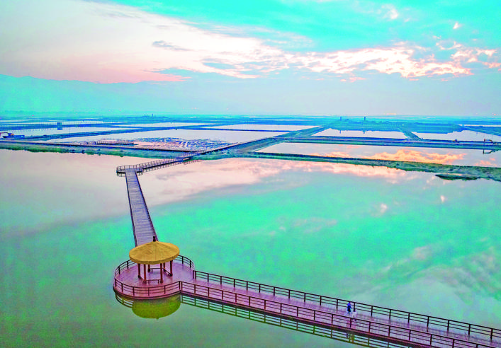 ▼11月14日拍摄的运城盐湖亲水观光木栈道。 该木栈道位于盐湖最东侧区域,是盐湖堤埝除险加固及生态修复项目一期的主要建设内容之一,长度约3公里,沿途设有3个亲水平台和休憩节点,为游客欣赏盐湖美景提供了更丰富的线路选择。 本报记者 常 奇 摄