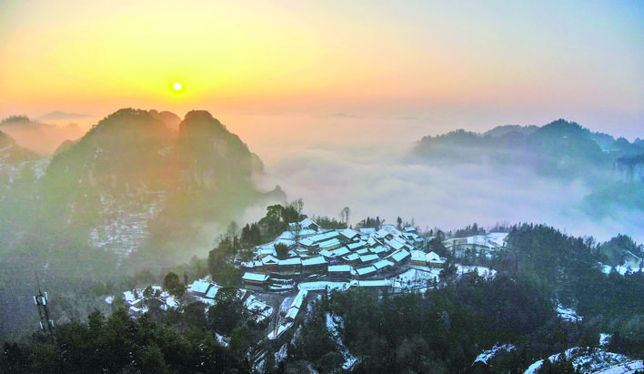湖南省湘西土家族苗族自治州花垣县双龙镇十八洞村雪后景色(2022年2月24日摄,无人机照片)。 新华社发(龙恩泽 摄)