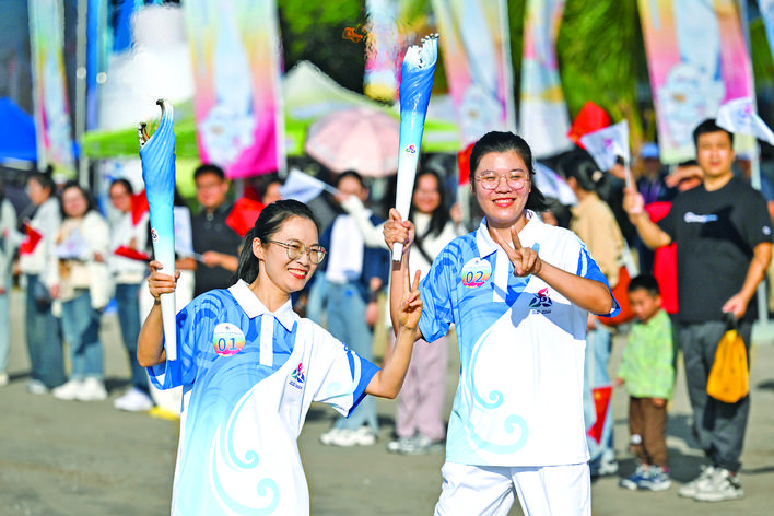 11月17日,火炬手韩晓燕与容飞(右)在火炬传递中。 当日,第十二届全国少数民族传统体育运动会火炬实地传递活动在海南三亚举行。 新华社记者 孙凡越 摄