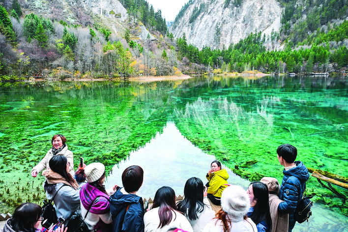 11月16日,游客在四川省阿坝州九寨沟景区五花海合影留念。 随着川青铁路镇江关至黄胜关段开通,以及G8513九寨沟至绵阳高速公路全线建成在即,以铁路、公路、飞机为代表的综合立体交通网正带动九寨沟县全域旅游发展。 新华社记者 刘莲芬 摄
