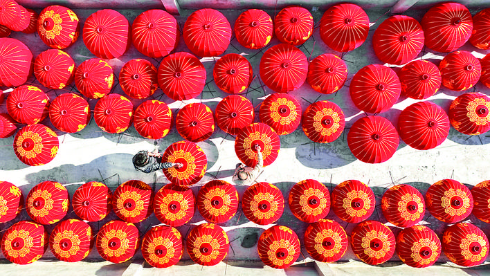 ▲近日,在河北省石家庄市藁城区梅花镇屯头村一家宫灯生产厂,工人在晾晒宫灯。连日来,屯头村宫灯生产厂家加紧制作灯笼,供应市场需求。藁城宫灯历史悠久,是河北省级非物质文化遗产。 新华社发(梁子栋 摄)