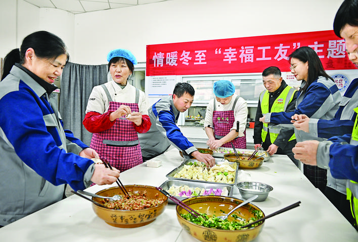 12月21日,在青岛地铁2号线二期01工区食堂,工友们在一起包饺子。 当日是冬至节气,许多在年底坚守一线的工人在工地食堂吃上了热气腾腾的饺子,感受冬日的温暖。 新华社发(李紫恒 摄)