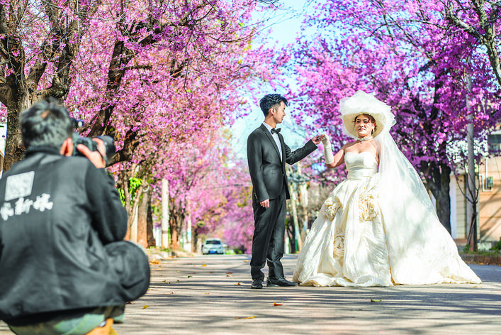 12月20日,一对新人在云南省大理白族自治州洱源县邓川镇德源山盛开的冬樱花下拍照。 新华社发(罗新才 摄)