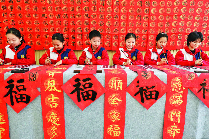 12月27日,河北省唐山市丰润区公园道小学的“小书法家”在创作迎新年作品。 元旦将至,各地中小学校、幼儿园开展形式多样的迎新年活动。 新华社发(朱大勇 摄)