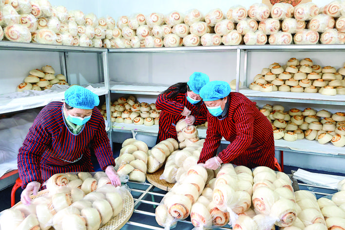 ◀1月7日,平陆县曹川镇鸿佳庄园油窝窝作坊内,弥漫着浓浓的年馍香味,员工们忙着装袋发货。
