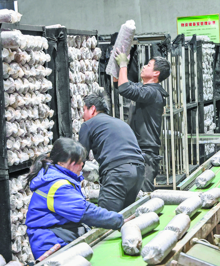 ▲1月5日,万荣县山西天地祥芮农业科技有限公司制棒生产车间内,工人们忙着加工香菇菌棒。