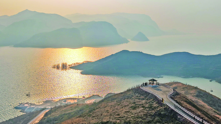 1月16日,垣曲县英言镇东寨码头的观景台上,游客在领略自然风光。薄雾下,远山、黄河水面相互映衬,宛如一幅美丽的水墨画。
