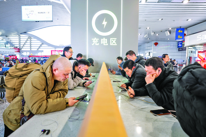1月17日,乘客在宁波火车站内新设立的免费充电区域给手机充电。 为提升旅客出行体验,宁波火车站近期在候车室内新设立了4个免费充电区域,设有充电插座96个,能够供给各类电子设备充电,帮助乘客缓解春运旅途中的“电量焦虑”。 新华社记者 江 汉 摄