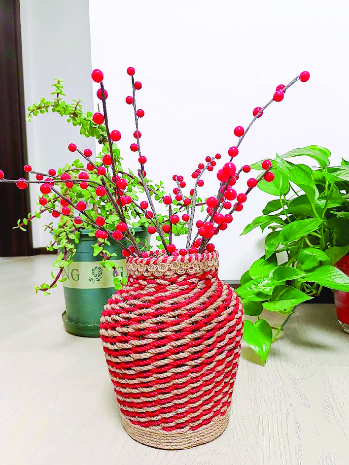 信手拈一只瓶子或盖子,薛精雅便有创意,脑中就会勾勒出一个造型,一段麻绳在手,缠缠绕绕跃然指间,多少灵感巧思就渗透在一个个作品里,娴熟精湛的技艺织就了绵延无尽的美好。一根麻绳就是一支笔,谱写别样的人生芳华。