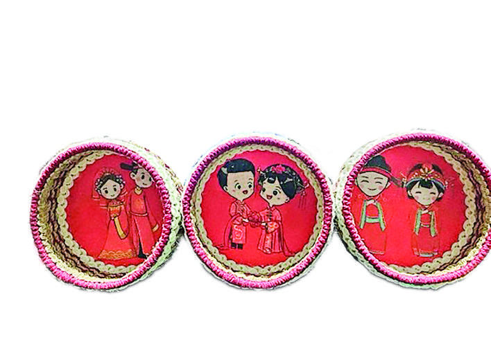 她的家位于临猗县北城的一幢三层小院。进得家来,我们直接奔到三楼,整个三楼都是她的工作室。屋中的一角堆放着用过的一次性饭盒、奶茶杯子、八宝粥盒子、可乐瓶子、茶叶罐子等,足足占用了将近小半个房间。看我惊讶的表情,薛精雅笑道:“你看我是不是像个收破烂的呀!这些可都是我工作的基石呢。刚开始就是给家里编些装小物件的收纳盒,谁知从此一发不可收,一天天眼里就只会到处扫描破烂。”经过薛精雅的巧手,这些废品都可以变废为宝。来到另一侧的工作区域,就像是走进了一场麻绳的盛宴,桌上摆的、墙上挂的,有复古优雅的手提包、简约清新的纸巾盒、精致实用的手机支架和笔筒……琳琅满目,应有尽有,但最令人瞩目的还是一组组婚庆主题的麻编作品,有托盘、捧盒、双喜、灯笼、花瓶,等等,看起来又喜庆又好看,幸福的气息扑面而来,真是人见人爱的婚庆新宠。