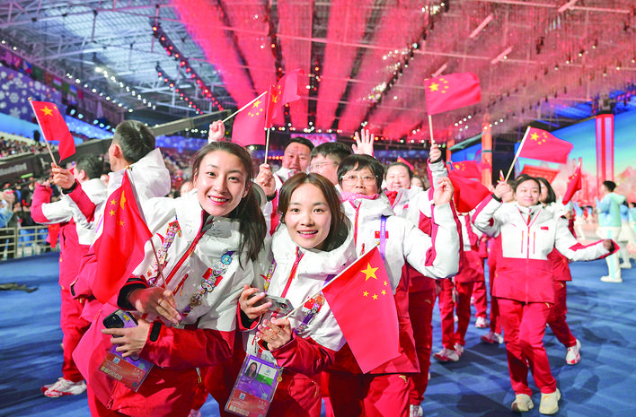 东道主中国代表团最后入场亮相。全场观众挥舞着手中的五星红旗,欢呼声经久不息。本届亚冬会共设6个大项、11个分项和64个小项,1200余名运动员参赛,创下赛会历史新高。其中,中国代表团派出170名运动员,实现全项目参赛。