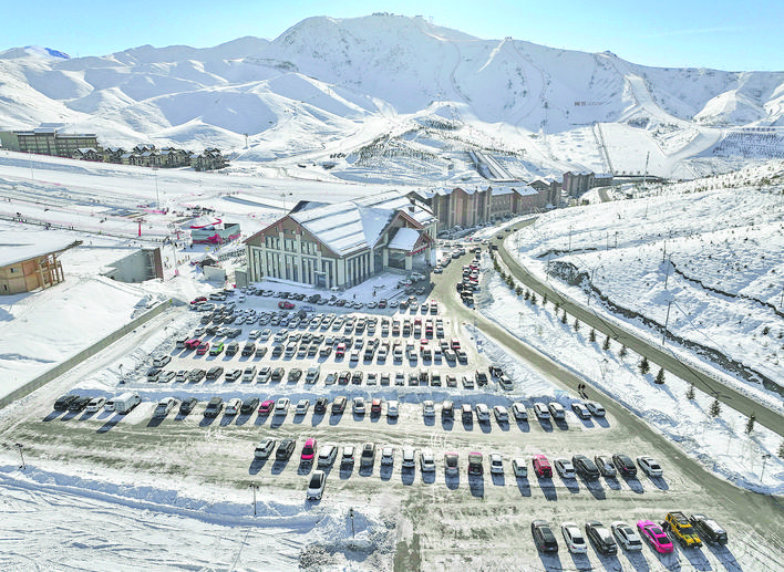 游客的车辆停在新疆阿勒泰将军山国际滑雪度假区游客服务中心旁(2025年1月24日摄,无人机照片)。 新华社记者 胡虎虎 摄