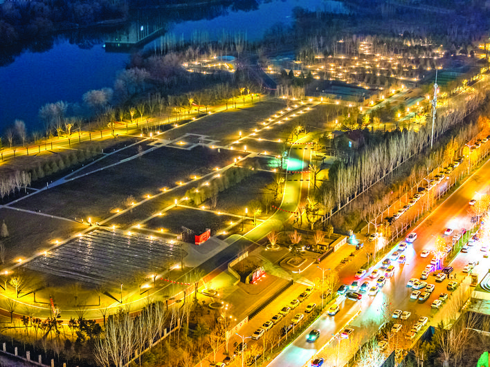 官道河生态修复与整治工程项目舜风公园(中心城区万达广场北侧片区)夜景璀璨(2月9日摄)。