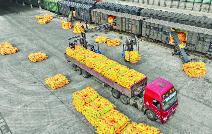 ▶2月6日,位于稷山县的潞安化工丰喜泉稷能源有限公司铁路专用线上,工人在装运化肥。 特约摄影 栗卢建 摄