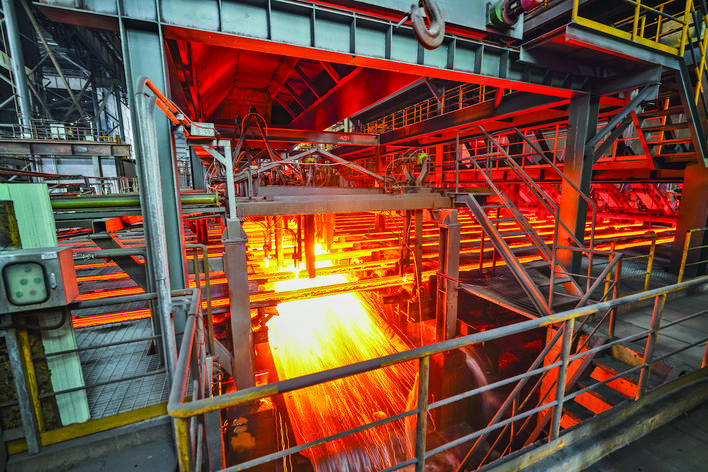 在铭福钢铁的炼铁车间,1230立方米新置换的炼铁高炉极速作业中;在炼钢车间,通红的钢材被整齐切割成一块一块……