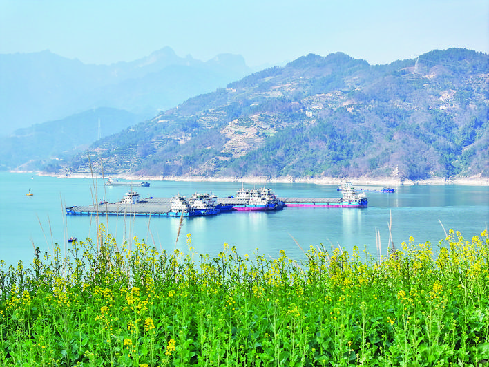 2月9日,船舶停靠在三峡大坝上游的湖北省秭归县水域(无人机照片)。 早春时节,三峡库区湖北省秭归县峡江两岸油菜花、山花竞相绽放,春意渐浓。 新华社发(王辉富 摄)