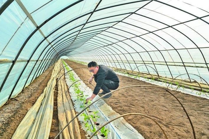 2月9日,永济市虞乡镇洗马村农业设施大棚内,瓜农在查看新栽西瓜秧苗的生长情况。