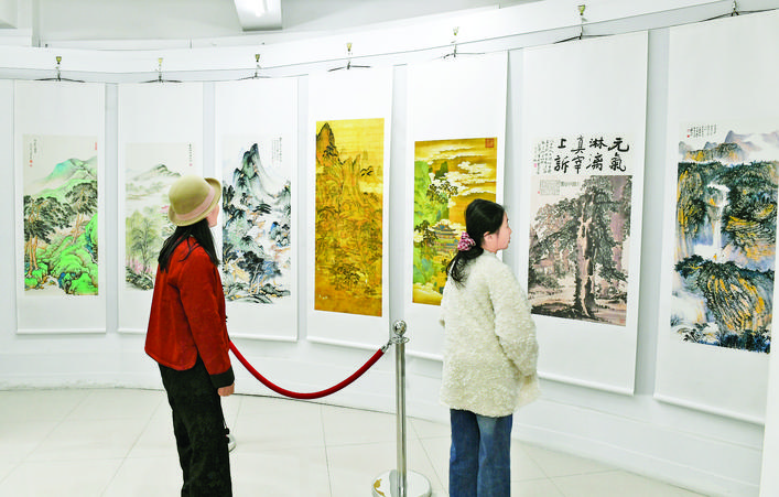 2月3日,“大美河山”中国山水画的境界暨“新生活 新风尚 新年画——我们的小康生活”美术展现场,市民欣赏一幅幅精美的山水画,感受绘画的独特魅力,共享新春幸福喜乐。