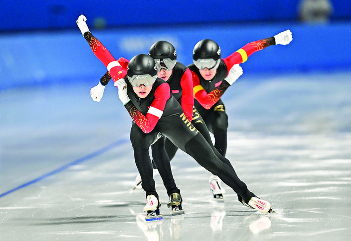 2月11日,中国队选手刘瀚彬、吴宇、哈那哈提·木哈买提(从前到后)在比赛中。 当日,第九届亚冬会速度滑冰男子团体追逐决赛在哈尔滨举行。中国队夺得冠军。 新华社记者 陈振海 摄
