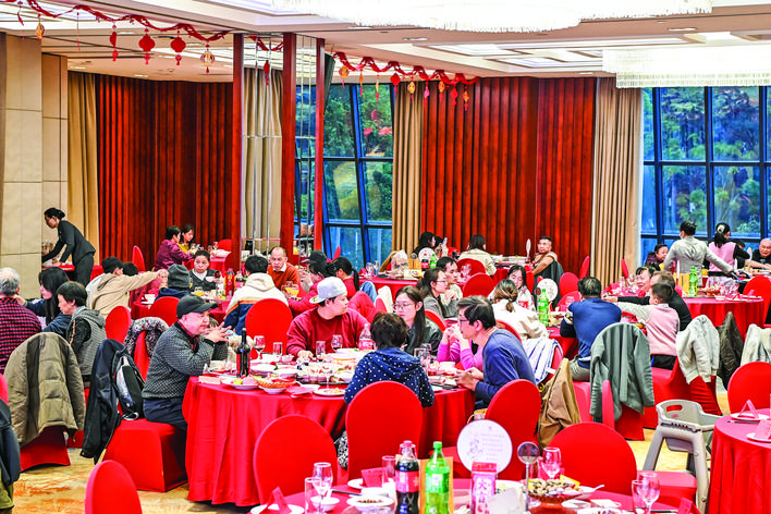 1月28日,人们在广西南宁市一家餐厅吃年夜饭。 新华社记者 曹祎铭 摄