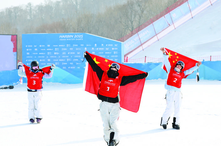 2月12日,在亚布力举行的第九届亚冬会自由式滑雪女子大跳台决赛中,中国选手刘梦婷、韩林杉、杨如意分别获得冠、亚、季军。 新华社记者 张晨霖 摄