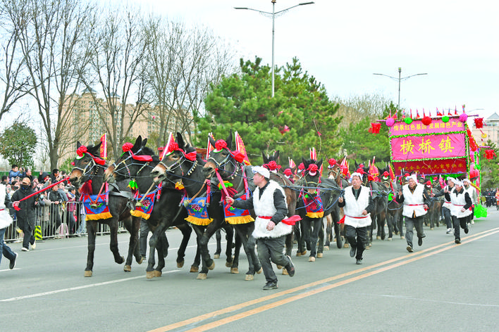 横桥镇符村、刘家庄村、宋温庄村、郭家庄村、文侯村等村的文艺爱好者表演了《喜庆秧歌》。他们身披盛装,手舞彩扇,步伐铿锵,尽情地展示基层群众的别样风采。中村北村、孙家院村、南庄村等村带来的现代舞《盛世绛州》,节奏欢快,激情四射,赢得现场观众阵阵掌声。该镇选送的马拉鼓车表演更是令人称绝,激昂的鼓乐声、奔放的马蹄声、悦耳的铃铛声汇成一片。30多匹毛色、体型相近的骡马,头系红绸,脖系铃铛,背竖两面小战旗;装饰华丽的车上配有4面大鼓和锣、钹、镲等各种乐器,30余名鼓乐手在车上击鼓奏乐,20余名马夫挥鞭赶马,马车行进中,寓意五谷丰登的大鼓不停转动,如梅花盛开,惊艳全场。