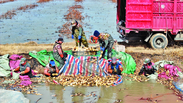 ▶2月12日,永济市蒲州镇黄河滩涂的藕池里,藕农在采挖莲藕。近期,当地万亩藕田迎来丰收季。 特约摄影 陈春明 摄