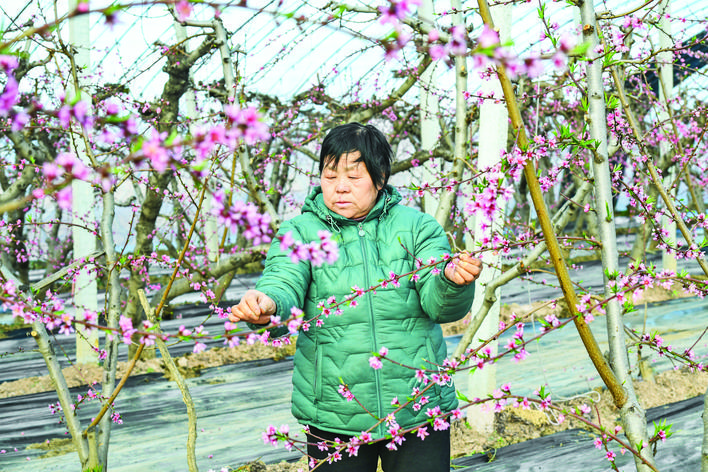 ▲2月12日,稷山县清河镇荆庄村的桃农在大棚内管理油桃树。