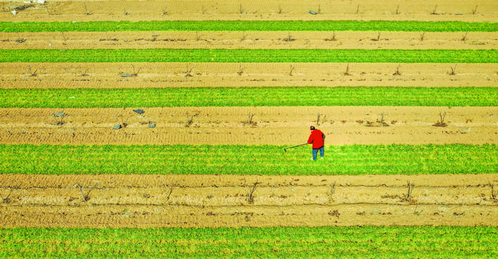 2月14日,夏县瑶峰镇大侯村一家庭农场员工在麦田里除草。当前,全市各地农民抢抓有利时机,积极开展农业生产,田间地头呈现一派人勤春早的农忙景象。 特约摄影 张秀峰 摄
