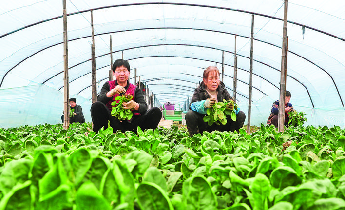 ◀2月13日,闻喜县桐城镇邱村菜农在采摘菠菜,准备销往市场。