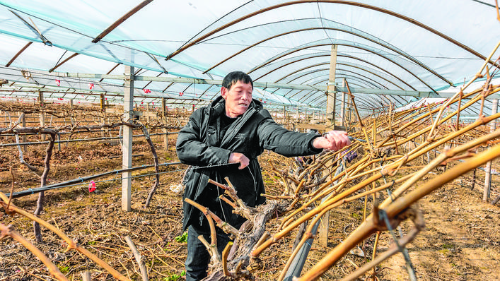 2月15日,永济市卿头镇永喜庄村一座生态葡萄园内,村民在修剪葡萄树枝条。 初春时节,气温回升。果农们不误农时,开展葡萄树修剪、除杂施肥等管护工作,为葡萄丰产丰收打好坚实基础。