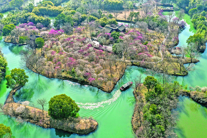 ▲2月18日,游客在杭州西溪湿地乘坐电瓶船赏梅。春意渐浓,西溪国家湿地公园里的梅花竞相绽放。 新华社记者 黄宗治 摄