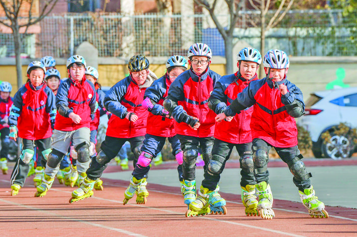 开启新学期后,河北省遵化市第六实验小学学生在体育课练习轮滑。 新华社发(刘满仓 摄)