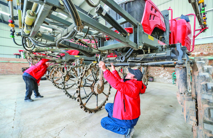 2月17日,平陆县祥宁种养专业合作社的农机手在检修农机。 本报记者 金玉敏 摄