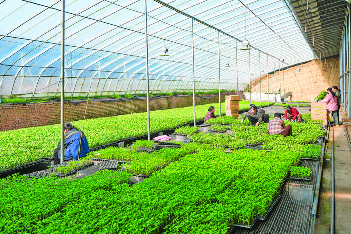 2月15日,夏县南大里乡夏鲜蔬菜智慧产业园的温室大棚内,工人们忙着管护菜苗。