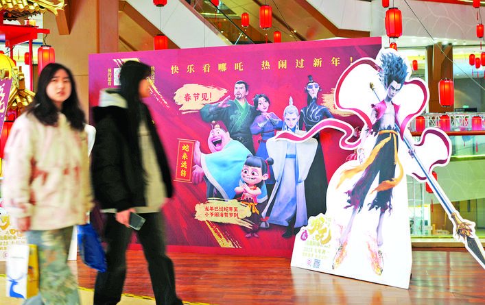 ▲2月18日,在沈阳一家商场,顾客从电影《哪吒之魔童闹海》的宣传广告牌前经过。 新华社记者 李 钢 摄