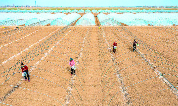 ▲2月18日,永济市卿头镇董村瓜农在瓜田施底肥,为早春西瓜秧苗进棚作准备,田间地头一派繁忙景象。特约摄影 杨建峰 摄