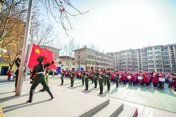 活动现场,全校学生着装整齐,迎着阳光庄严地进行升国旗、唱国歌活动。这是该校开展的一次升国旗爱国主义主题教育,也是新学期为全体学生上的“开学第一课”,拉开了新学期的序幕。