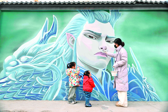2月19日,画师(右)在石家庄市裕华区富强大街与塔南路交口处创作哪吒主题墙绘。 日前,根据动画电影《哪吒之魔童闹海》创作的主题墙绘亮相石家庄街头,吸引市民前来参观打卡。 新华社发(陈其保 摄)