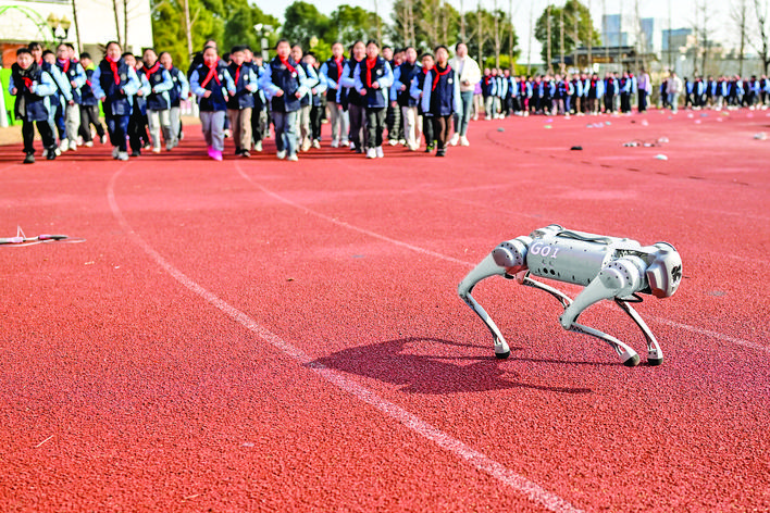 2月19日,在江苏省昆山市信义小学,机器狗带领学生在大课间活动跑步。 近日,江苏省昆山市信义小学在大课间活动中创新引入机器狗领跑,打造“科技+体育”特色项目,让学生们了解、探索、体验前沿科技的同时,激发对运动的兴趣。 新华社发(王须中 摄)