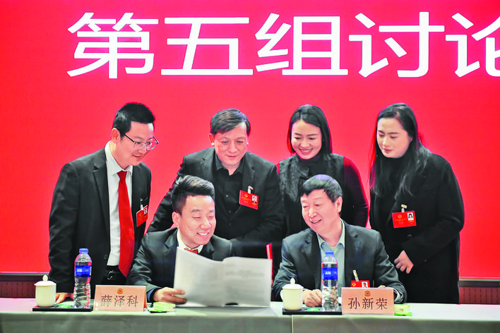 2月25日,参加市政协五届四次会议的共青团、青联、科协界委员讨论政府工作报告。 本报记者 朱超逸丁 摄