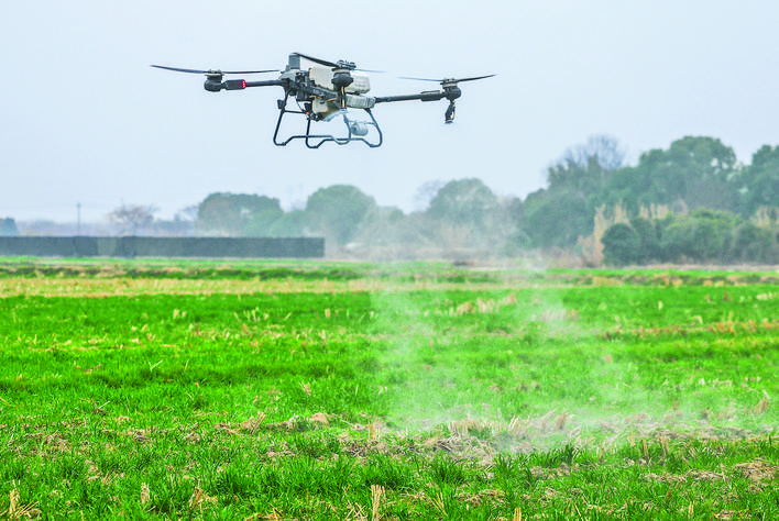 2月25日,在浙江省嘉兴市南湖区凤桥镇星火村,种植户操作植保无人机实施杂草防治作业。 眼下,在嘉兴市南湖区的多个农场内,无人机、自动喷洒机、自动旋耕机等农业自动化设备在进行翻地、播种、灌溉等多项任务,助力春耕春种。 新华社记者 徐 昱 摄