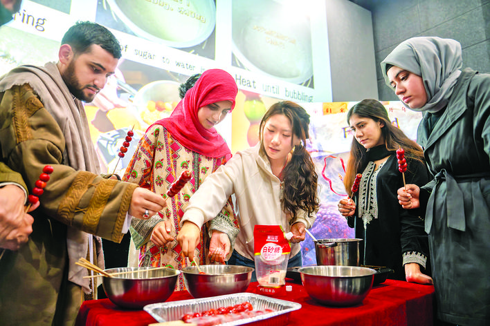 2月25日,在长沙摩天轮国际影城,留学生们在志愿者(右三)的指导下制作冰糖葫芦。 当日,湖南中医药大学以电影《哪吒之魔童闹海》为纽带,在长沙摩天轮国际影城开展“跟着‘哪吒’看中国”文化研学活动。留学生们观看电影后,了解电影片段中隐藏的中医药文化,体验冰糖葫芦制作,学习非遗剪纸技艺等,更直观地感受中国传统文化。 新华社记者 陈思汗 摄