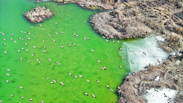 候鸟在黄河宁夏段一处湿地栖息、觅食(2月26日摄)。 随着天气逐渐转暖,黄河宁夏段迎来众多候鸟驻足。近年来,宁夏全力推动黄河流域生态保护和高质量发展先行区建设,黄河及两岸湿地的保护力度不断加大,生态环境持续向好,黄河两岸的滩涂、湿地已成为候鸟重要的补给站、栖息地。