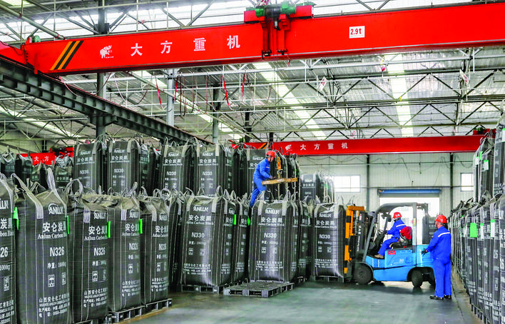 ▶2月28日,位于河津经济技术开发区的山西安仑化工有限公司生产车间,工人们在打包转运炭黑产品。