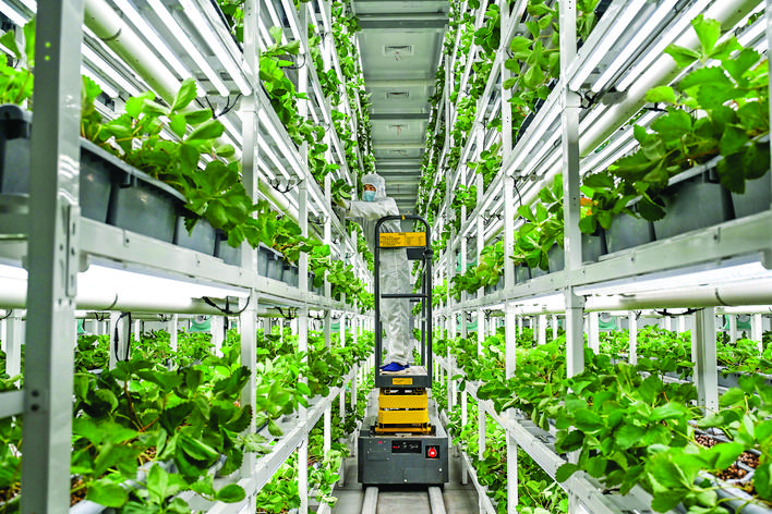2月28日,在位于回民区的内蒙古宇生乐谷丰现代农业产业园的植物工厂,工作人员在管护草莓植株。 近年来,内蒙古呼和浩特市回民区依托政企合作,建设现代农业产业园区,以数字化、智慧化科技赋能无土栽培等特色果蔬种植,提高农业生产效率和品质,带动农文旅融合发展和周边农民就业增收,有效助力乡村振兴。 新华社记者 李志鹏 摄