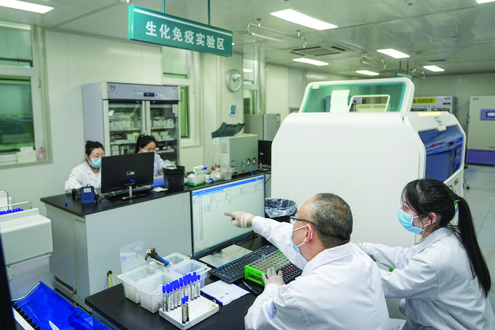 2月26日,在淄博市博山区中医院,工作人员在检验“医联体”成员送检的样本。 近年来,山东省淄博市试点推出中医日间诊疗服务,打造“随治疗、随回家”的新型住院模式。符合收治条件的患者入院后床位费、护理费按现行收费标准的30%执行,切实减轻了患者就医压力。同时,日间诊疗中心还充分发挥“医联体”作用,开展远程诊疗、验方、煎药服务,发挥中医适宜技术“简、便、验、廉”的治疗优势,满足群众多样化、多层次健康需求。 新华社记者 朱 峥 摄