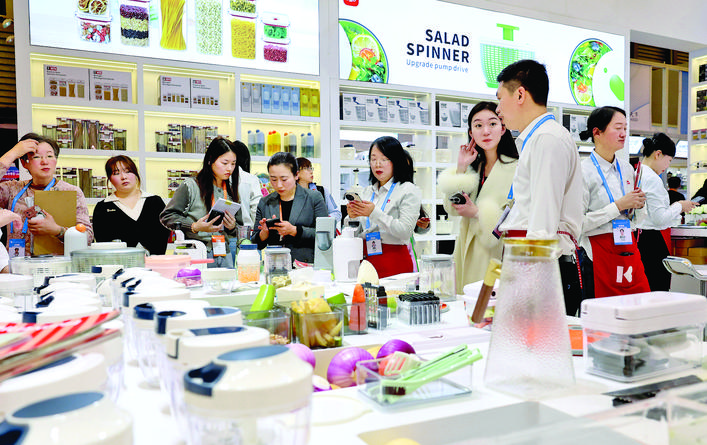 3月1日,人们在第33届华东进出口商品交易会一处家庭用品展位交流。 当日,第33届华交会在上海开幕。本届华交会展览总面积达11.5万平方米,共设服装服饰展、纺织面料展、家庭用品展、装饰礼品展四大专业子展及跨境电商、境外展区,总展位数突破5100个。 新华社记者 方 喆 摄