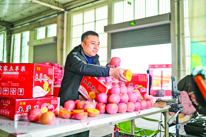 ▲万荣县五福村数字农业孵化中心运城市杨爱笑电子商务有限公司仓库内,一名主播在直播销售苹果。 本报记者 陈方斌 摄